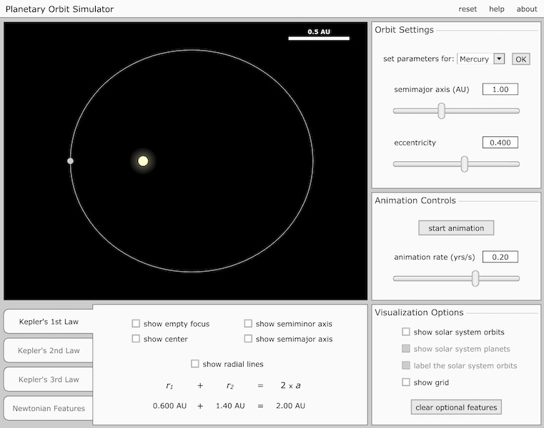 Flash simulation of an orbit that lets you control the parameters directly, and gives graphs and data showcasing how Kepler’s Laws relate to your setup. Built by the Nebraska Astronomy Applet Program.